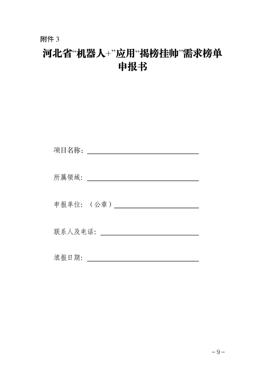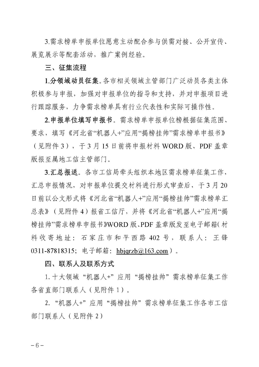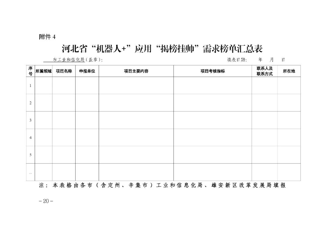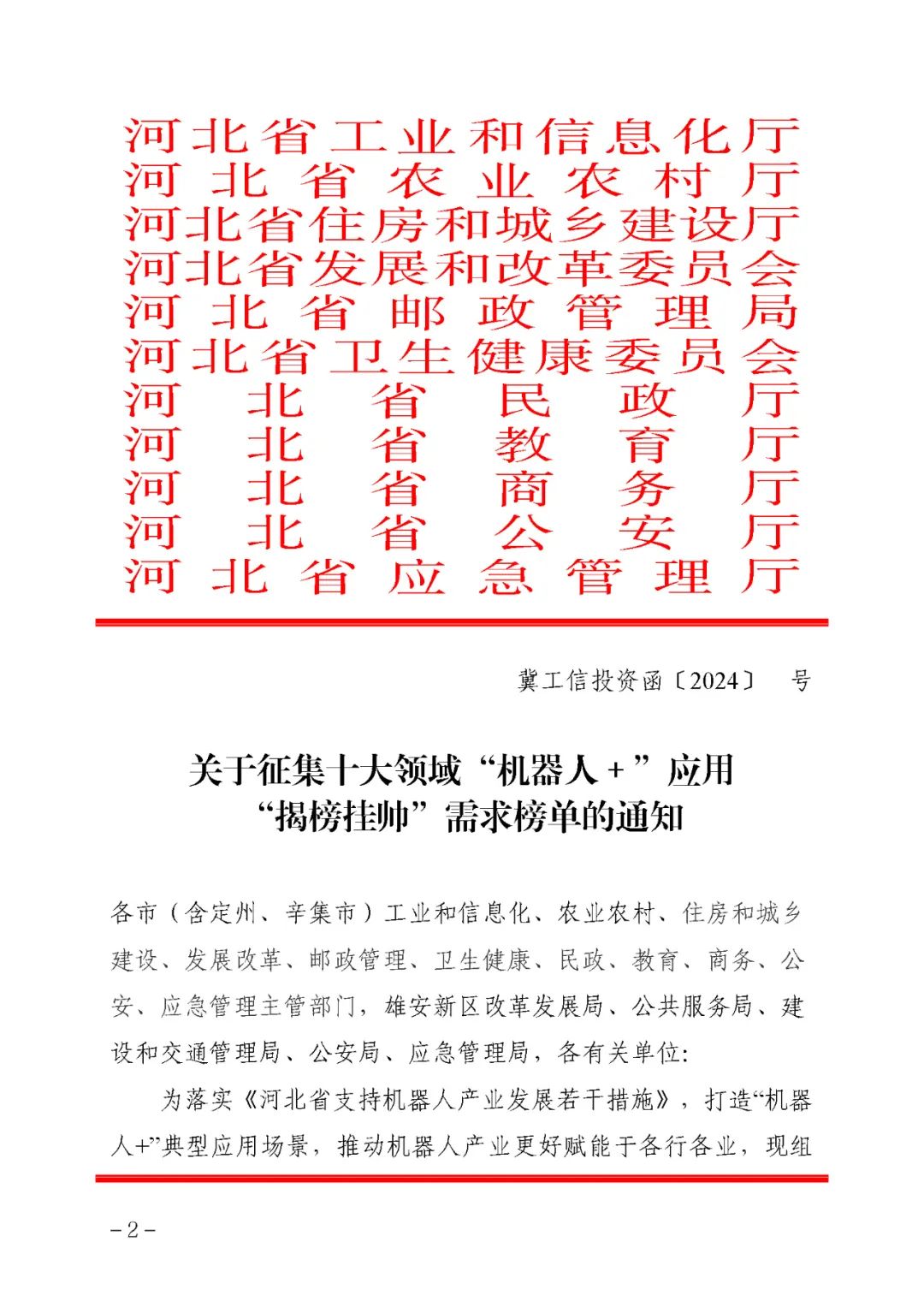 为落实《河北省支持机器人产业发展若干措施》,打造“机器人+”典型应用场景,推动机器人产业更好赋能于各行各业,省工信厅联合十部门组织开展十大领域“机器人+”应用“揭榜挂帅”需求榜单征集活动,征集通知具体内容请见附后文件。请新区范围内有意提交相关“机器人+”应用需求的单位按照要求认真填写附件中的申报书,并于3月15日前将申报材料WORD版、PDF盖章版发送至邮箱:gfjxxcyz@163.com。我们将结合申报情况研究新区支持政策。雄安新区改革发展局