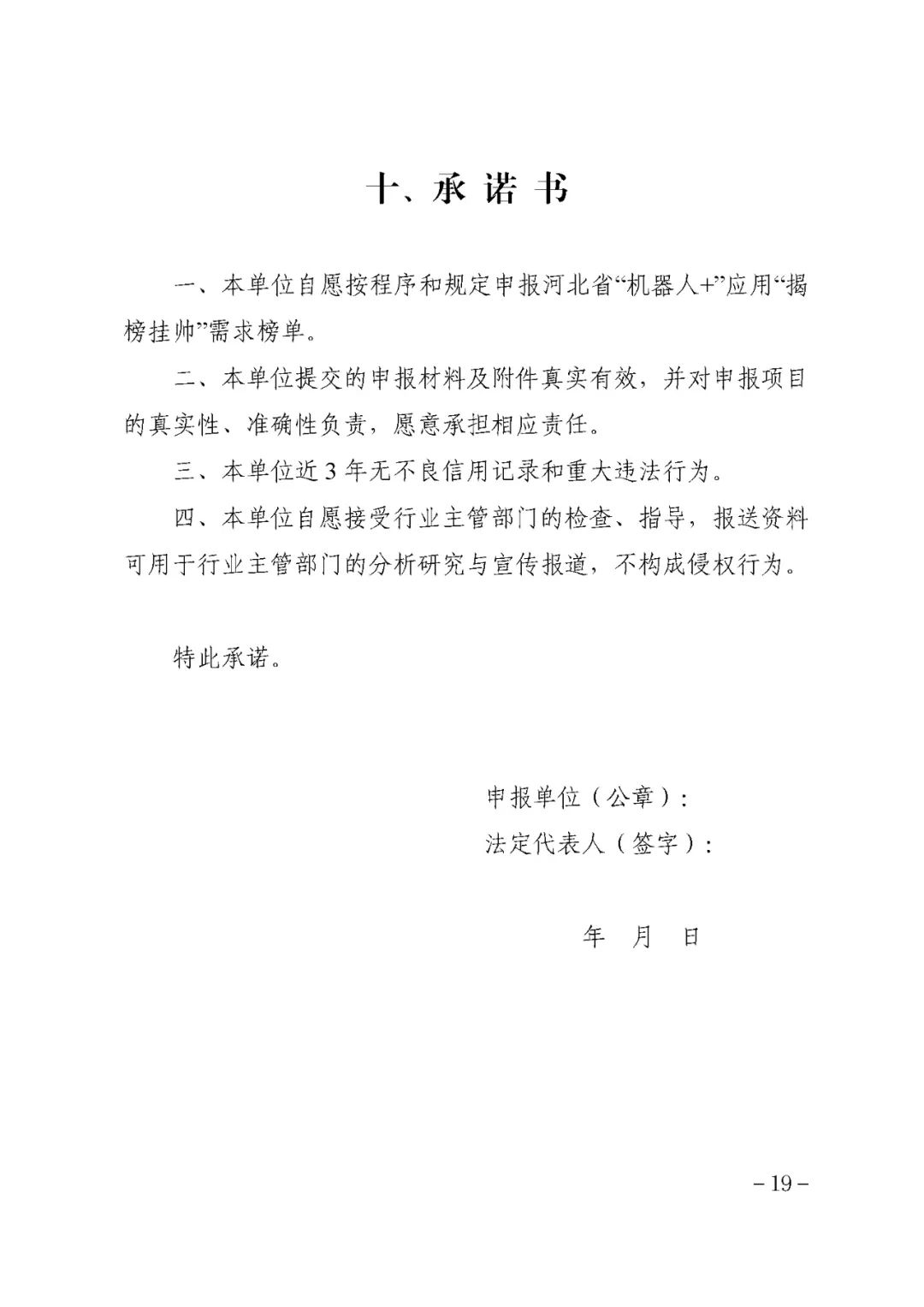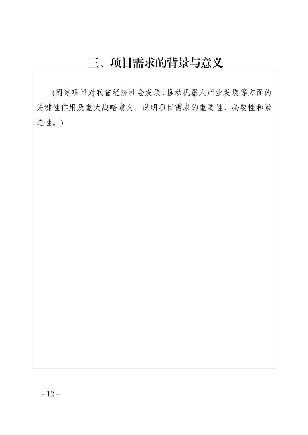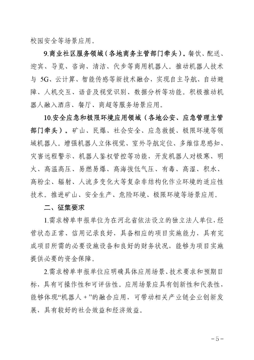 为落实《河北省支持机器人产业发展若干措施》,打造“机器人+”典型应用场景,推动机器人产业更好赋能于各行各业,省工信厅联合十部门组织开展十大领域“机器人+”应用“揭榜挂帅”需求榜单征集活动,征集通知具体内容请见附后文件。请新区范围内有意提交相关“机器人+”应用需求的单位按照要求认真填写附件中的申报书,并于3月15日前将申报材料WORD版、PDF盖章版发送至邮箱:gfjxxcyz@163.com。我们将结合申报情况研究新区支持政策。雄安新区改革发展局