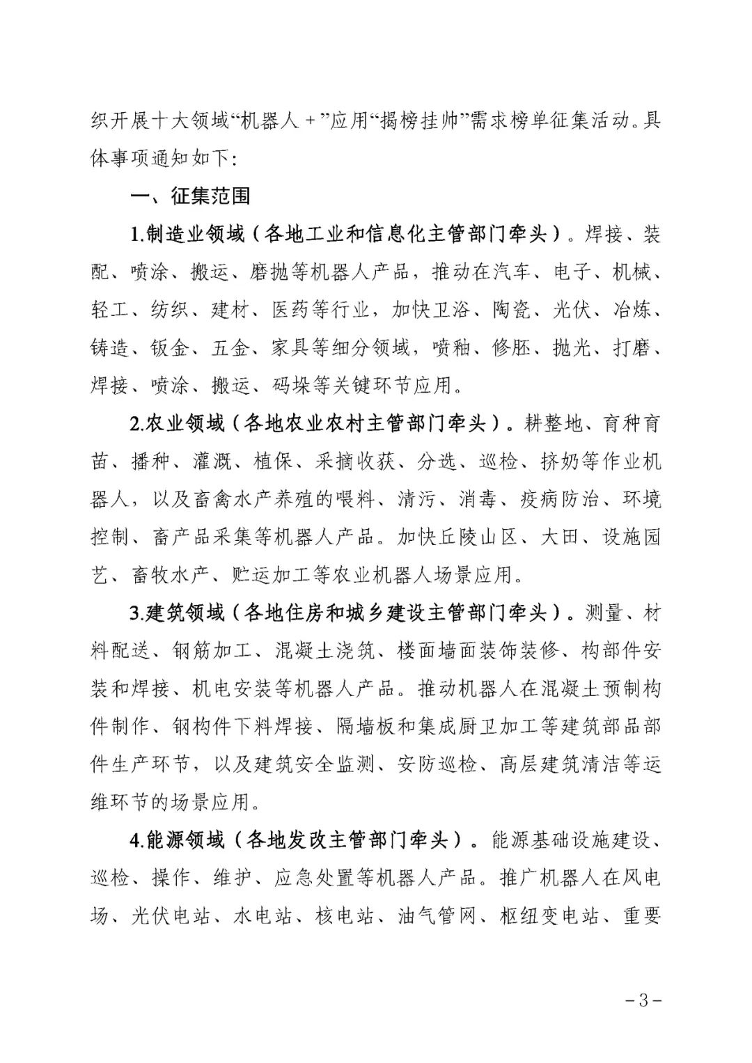 关于征集十大领域“机器人+”应用“揭榜挂帅”需求榜单的通知