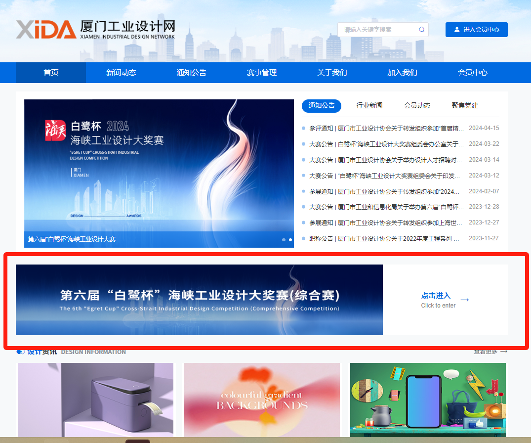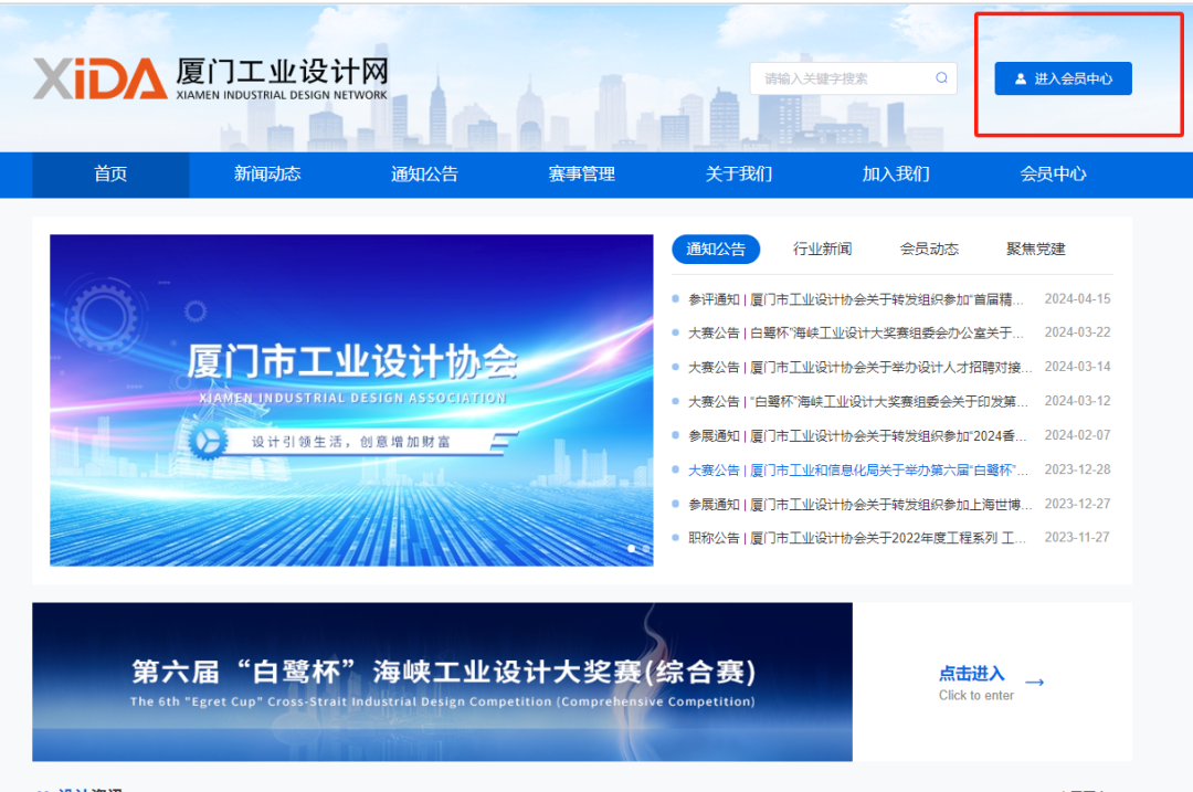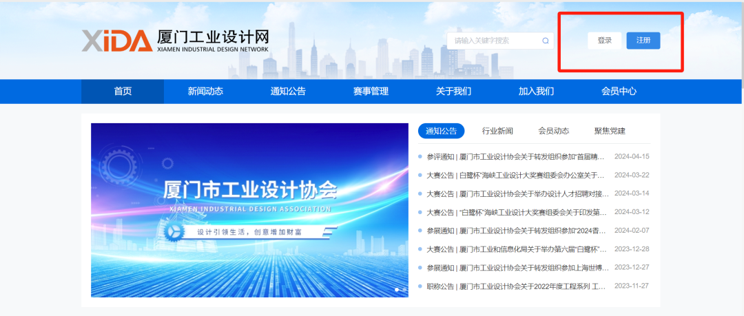 进入“厦门工业设计网”,点击右上方注册按钮进行账号注册。 可根据实际情况,选择“个人”“企业”“高校”身份进行注册。