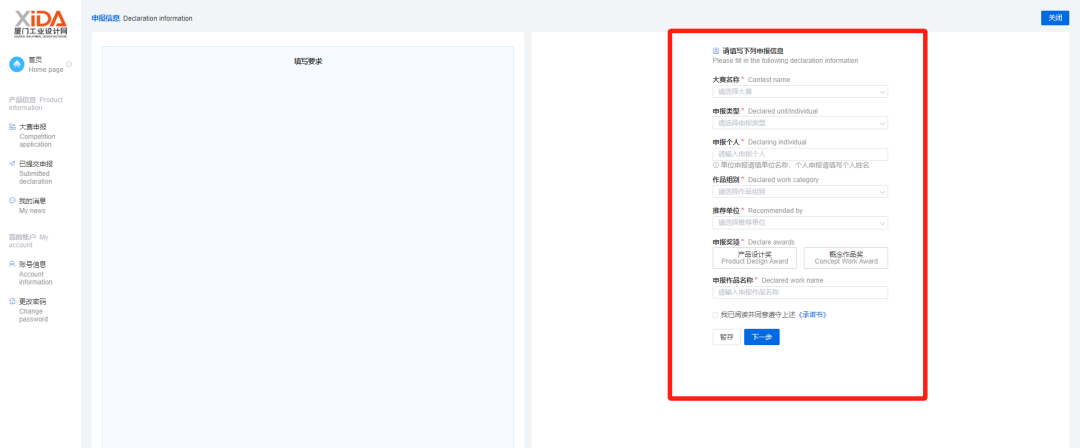 进入作品申报页面后,勾选大赛名称“第六届白鹭杯海峡工业设计大奖赛”,并填写申报类型、申报个人、作品组别、推荐单位、申报奖项、申报作品名称等信息。