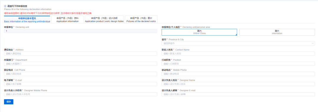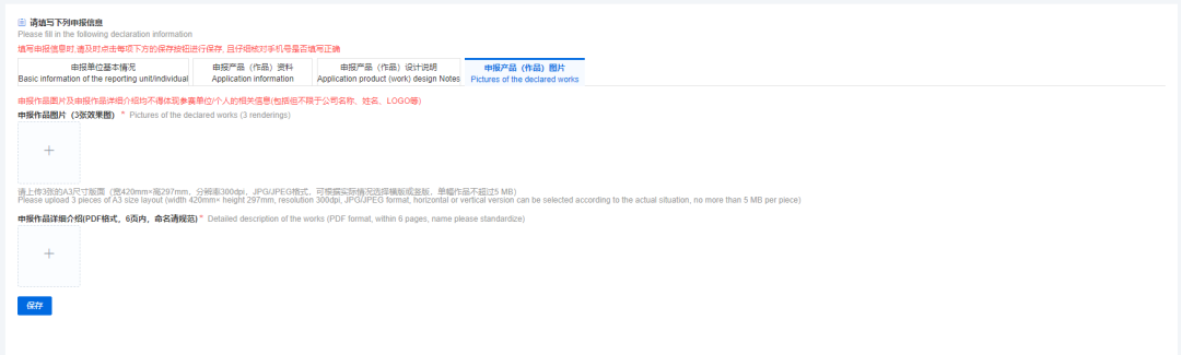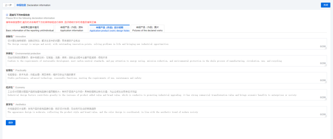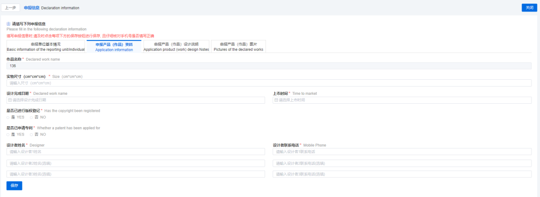 根据网站提示,先后填写“申报单位情况”“申报产品(作品)资料”“申报产品(作品)设计说明”“申报产品(作品)图片”。 在每个步骤的填写都请按底部“保持”按钮。 若未填写完整,系统将在提交时提示。