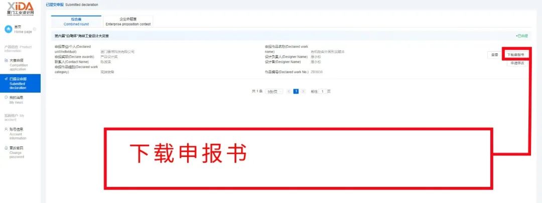 在查看“已申报作品”时,及时点击“下载申报书按钮”,在大赛官网公示初评名单后,通过初评的作品根据流程进行申报书盖章(签字)上传流程。